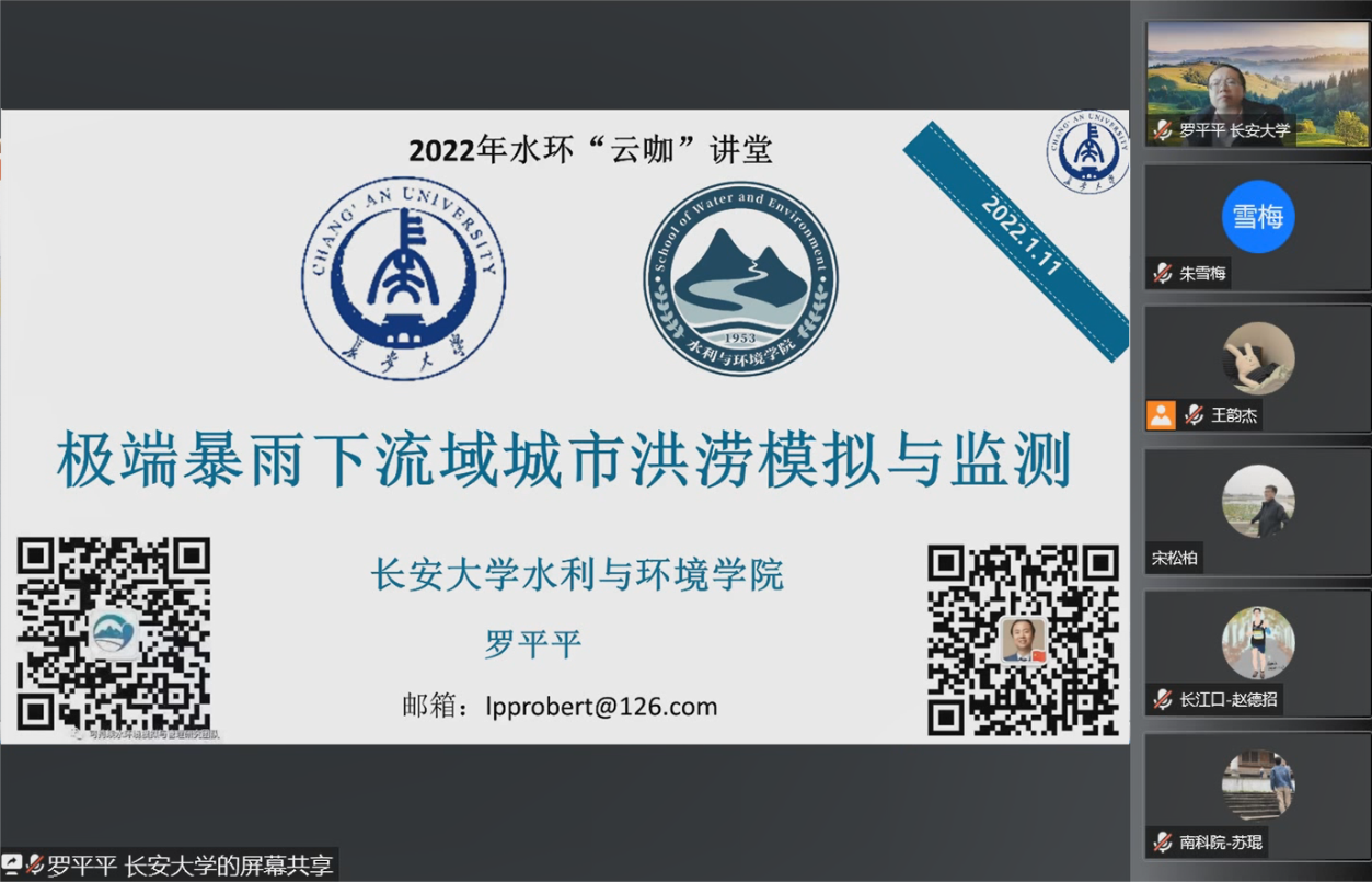 1月11日上午,pg娱乐电子游戏官网入口举办“云咖”讲堂第5讲,邀请罗平平教授为做“极端暴雨下流域城市洪涝灾害模拟与检测预警”报告,pg娱乐官网全体研究生参加,研究生主管魏玮主持。