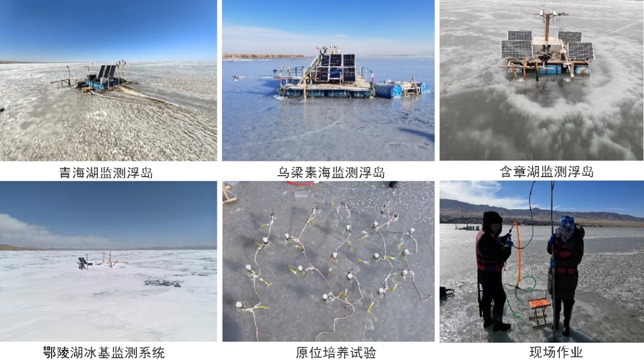 监测湖泊网络由青藏高原青海湖和鄂陵湖、内蒙古高原乌梁素海和东北平原含章湖构成。青海湖、乌梁素海和含章湖均依托项目组自主研发的高原湖泊“气-冰-水(-泥)”生态环境原位监测人工浮岛遥控系统(FROS)来执行全冰季监测任务,鄂陵湖则依托冰基监测系统,搭载了冰情、水文气象、湖泊理化生关键指标的多类在线传感器。因现场试验和定期采样的需要,统筹组合人员,完成了青海湖和鄂陵湖自2022年12月18日至2023年4月25日、乌梁素海自2022年12月7日至2023年3月24日、含章湖自2022年12月1日至2023年2月24日的现场值守、作业。