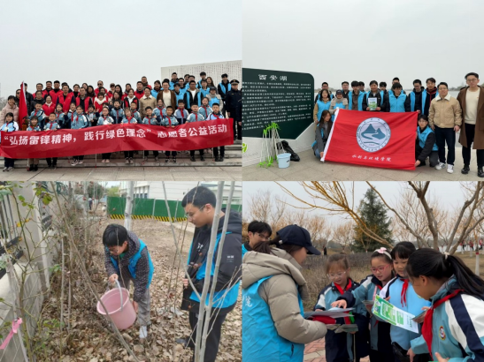 学院联合雨润星雨华府社区、经开第六小学及城管大队,赴西安湖开展“护水净滩”行动。志愿者分组清理湖岸垃圾、检测水质、宣传环保知识,以行动诠释志愿精神。植树节期间,“植此青绿”系列活动同步展开,青年学子科学养护树苗、维护校园绿植,用汗水浇灌绿色希望,展现新时代青年的责任担当。