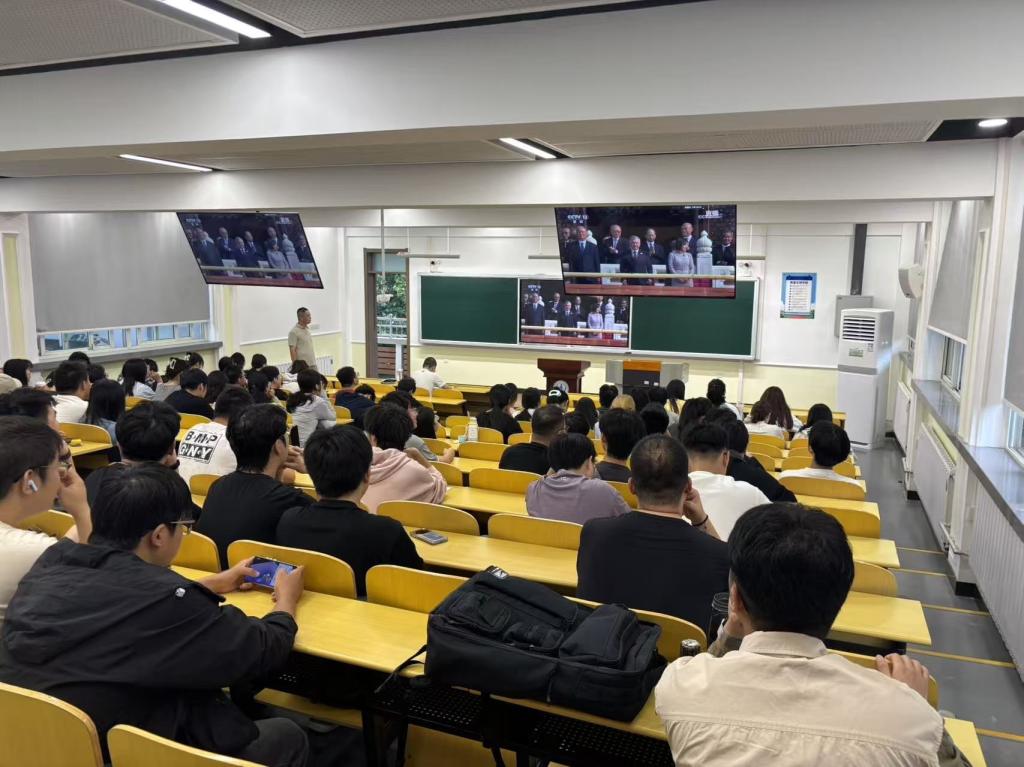 2025年9月3日9时,pg娱乐电子游戏官网入口党委组织师生在学院会议室、学术报告厅、多媒体教室等多个场所集中收看纪念中国人民抗日战争暨世界反法西斯战争胜利80周年大会直播。