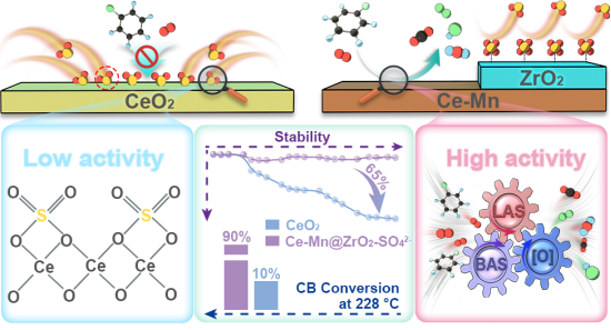 挥发性有机化合物(VOCs)是形成光化学烟雾和细颗粒物最关键的前体之一,其中,含氯挥发性有机化合物(Cl-VOCs)因具有环境持久性和高毒性,严重危害人体健康和大气环境。将有害的Cl-VOCs降解为无毒的CO2、H2O和可溶性HCl具有非常重要的意义。催化降解技术因具有多组分普适性,高矿化率被公认为降解低浓度Cl-VOCs最有效的技术之一。催化降解技术虽能将其转化为无害物质,却面临氯/硫中毒及水汽干扰等挑战。当前研究通过酸处理增强催化剂布朗斯特酸性位(BAS)以促进C-Cl键断裂,但会削弱路易斯酸位(LAS)导致矿化不彻底;而金属掺杂强化LAS虽提升氧化能力,却因BAS不足产生氯化副产物。基于此,本文设计的多功能Ce-Mn@ZrO2-SO42-催化剂通过三重协同机制突破瓶颈:1)表面SO42-基团作为BAS促进氯苯C-Cl键解离,同时通过空间位阻效应和静电排斥作用抑制SO2吸附;2)Ce-O-Mn结构加速电子转移,增强LAS酸性与还原能力,驱动脱氯中间体深度矿化;3)丰富的氧空位协同BAS激活气相氧并加速Cl自由基脱附。实验表明,该催化剂在含100 ppm SO2环境下仍保持高效氯苯降解性能,氯化/硫酸化副产物显著减少。该研究为开发兼具高活性、抗硫性与选择性的非贵金属催化剂提供了创新策略,对工业CVOCs深度净化具有重要应用价值。