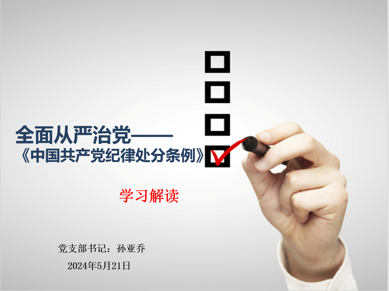 首先,孙亚乔同志为大家讲述名为《全面从严治党-中国共产党纪律处分条例解读》的党课。她从党的规矩、党的纪律、党纪处分工作原则、党纪处分种类和后果、党纪处分条例的“五大亮点”和党纪负面清单“六大纪律”几个方面对党纪开展深入浅出的讲解,进一步引导党员同志学纪律、知纪律、明纪律、守纪律。随后,分别由高倩、李辰、车红荣老师带领大家共同学习《中国共产党纪律处分条例》第四章、第五章和第六章的具体内容,并共同学习了习近平总书记在2024年全国两会期间发表的重要讲话精神。